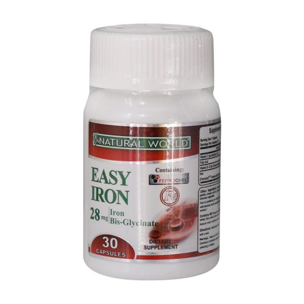 کپسول ایزی آیرون نچرال ورلد پاسخ مناسب برای رفع نیاز بدن به آهن و کمک به درمان کم خونی ناشی از مواد زیر است: رژیم های لاغری و گیاه خواری، اهدای منظم خون، دوران قاعدگی، فقر آهن این محصول دارای ۴ برابر جذب بیشتر آهن نسبت به فروس سولفات بوده و دارای حداقل عوارض گوارش از جمله تهوع و یبوست است. کپسول ایزی آیرون زمانی نیاز می شود که شما دچار درجه ای از کم خونی شده باشید که با تغذیه و مصرف مواد خوراکی موثر هم درمان نشوید. در این زمان پزشک با توجه به شرایط بدنی شما این مکمل را پیشنهاد می کند. این کپسول حاوی آهن به صورت فروس بیس گلیسینات، فولیک اسید، ویتامین B۱۲ و ویتامین C نیز بوده و در درمان کم خونی ناشی از فقر آهن بسیار موثر است.